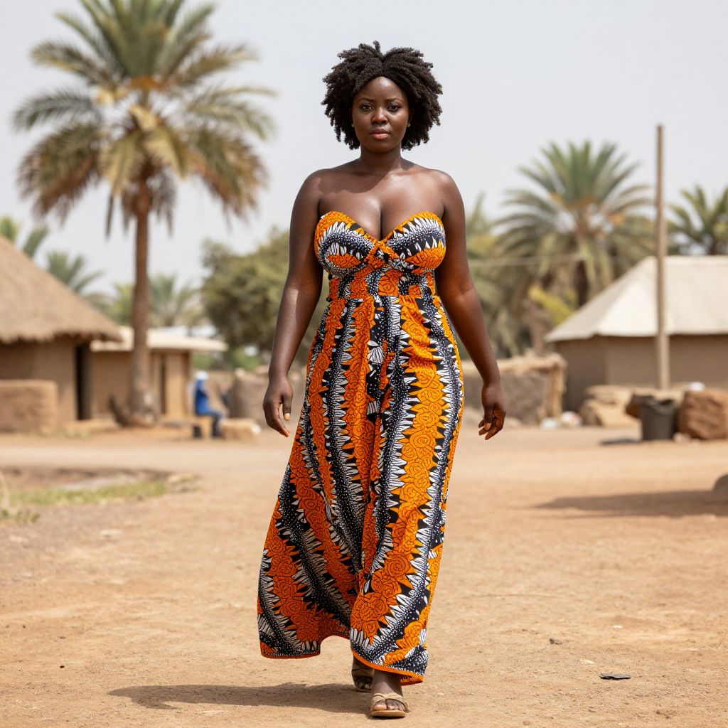 Photograph of a tall, dark-skinned African woman with natural, voluminous black hair, walking confidently on a dirt path. She wears a strapless, floor-length dress with a vibrant orange, black, and white geometric pattern. The background features a rural village setting with thatched-roof huts, palm trees, and a slightly blurred figure in the distance. The sky is bright, suggesting midday sunlight. The woman's dress contrasts with the earthy tones of the path and huts, highlighting her presence in the scene. She wears simple brown sandals. The overall composition emphasizes her strong presence and the colorful, patterned dress against the rustic backdrop.