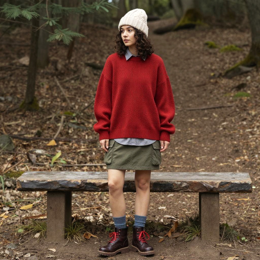 A toned woman in casual streetwear, oversized red knitted sweater layered over a grey collared shirt, olive green cargo mini skirt, blue-grey crew socks, and dark brown leather ankle boots with red laces, wearing a cream cable knit beanie, set against the backdrop of a forest trail with a rustic bench, visual style: hakusensha. Sexy. Pretty face and beutiful eyes