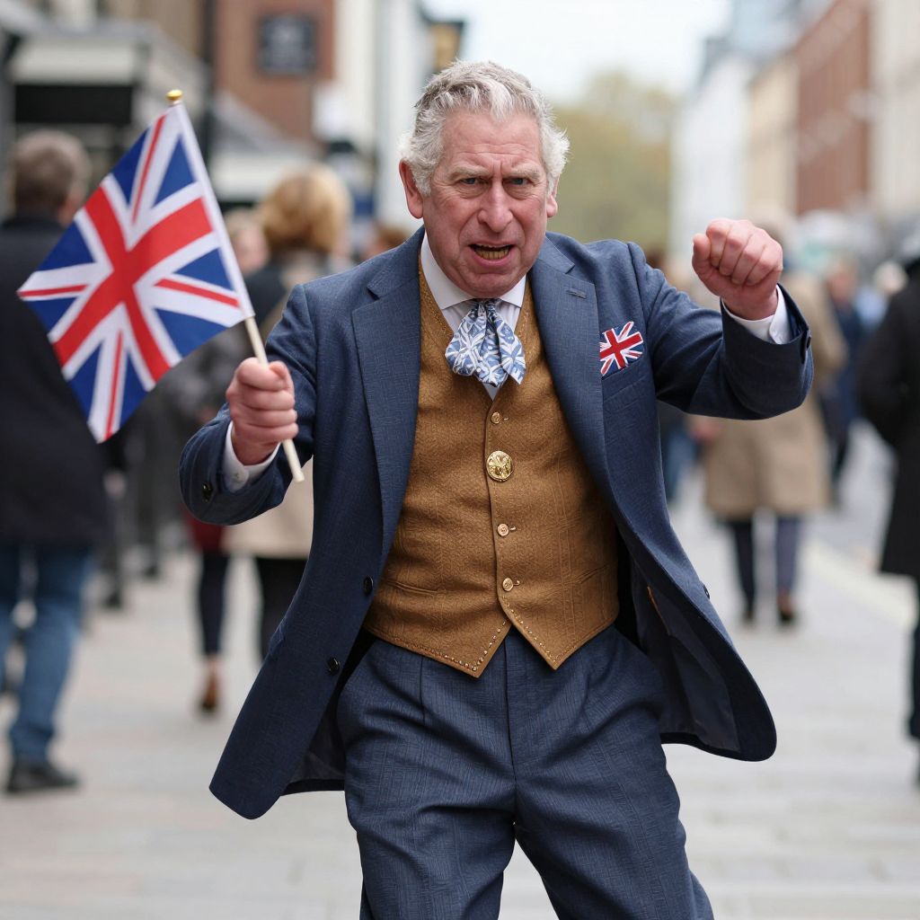 Apothecary Prince Charles of England, hyper realistic, Union Jack in one hand, English Flag in other hand, as a mean, crazy, dispirited, grumpy, mad old man dancing in the street,