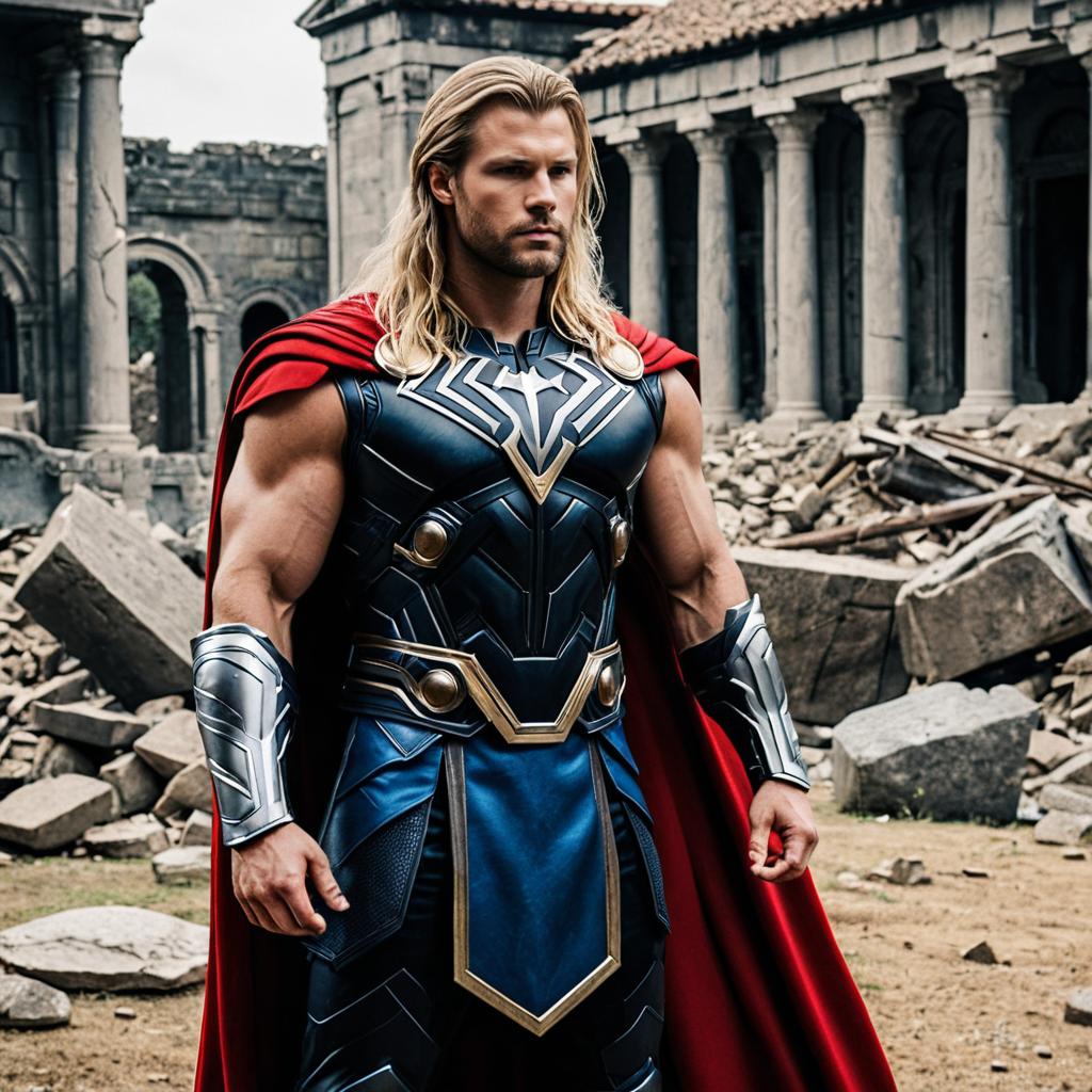 Adult premium thor costume, photorealistic, muscular blonde man, standing, wearing black armored chest and arm pieces, red cape, blue leather skirt, serious expression, long hair, slight beard, outdoors, ruined ancient building background, stone debris, statue in background, daytime, realistic lighting, Superman-like costume, comic book hero, CGI, cinematic style