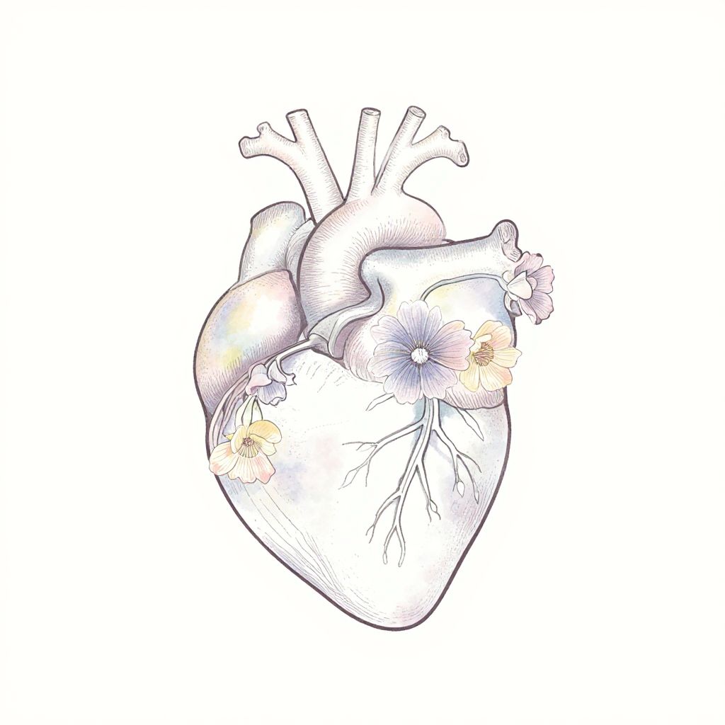 Simple anatomical heart with flowers intertwined, delicate petals blooming from veins, soft pastel colors, elegant line art style, minimalistic background, serene and calming mood, botanical elements blending with human anatomy, fine detailed strokes.