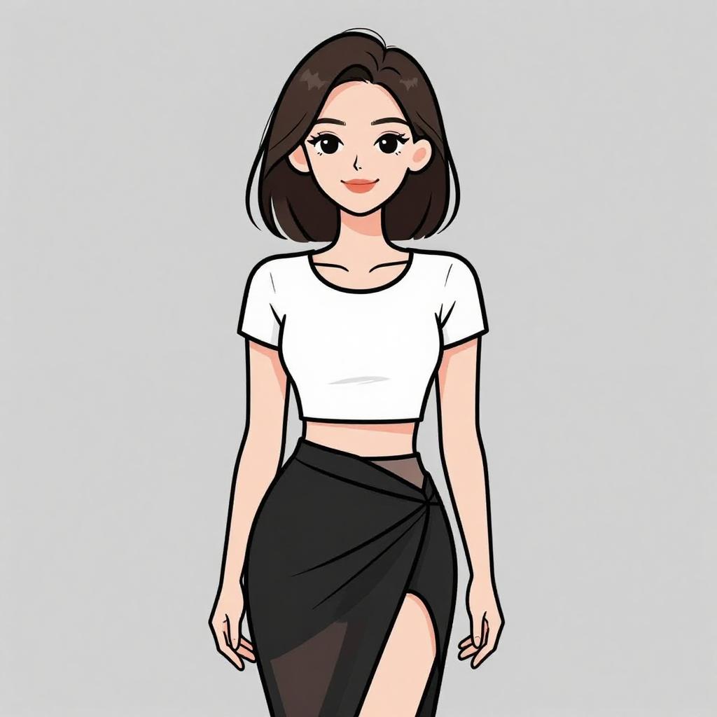 Woman with pretty face and pretty hair. smiling Woman, casual, white crop top with midriff cutout, sleeveless, high-waisted black pencil skirt with white side stripes, knee-length. --sref 1467