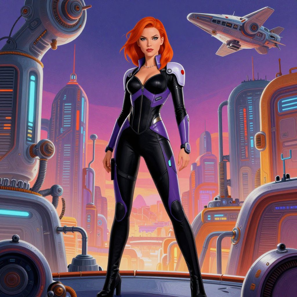 Digital artwork of a red-haired woman in a black, form-fitting suit with purple accents, standing confidently in a futuristic cityscape with flying vehicles and