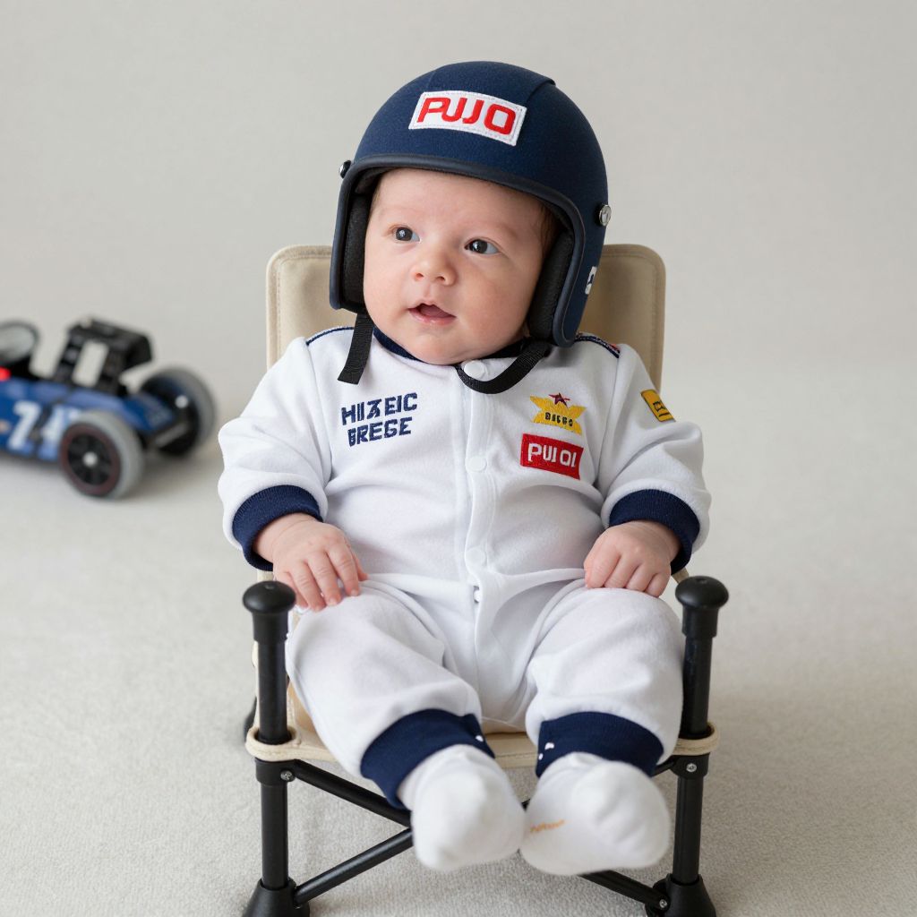 Newborn Race Car Driver Costume, baby in a racing suit and helmet sitting on a chair