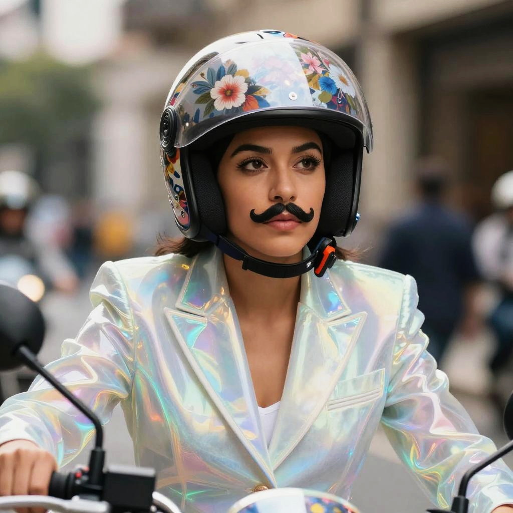Realistic photo of a Hispanic woman around age 30 wearing a translucent iridescent tailored suit and a motorbike helmet decorated with colorful floral patterns. She sports a quirky black mustache and is riding a motorbike in an urban setting, showcasing a blend of futuristic and flamboyant style.
