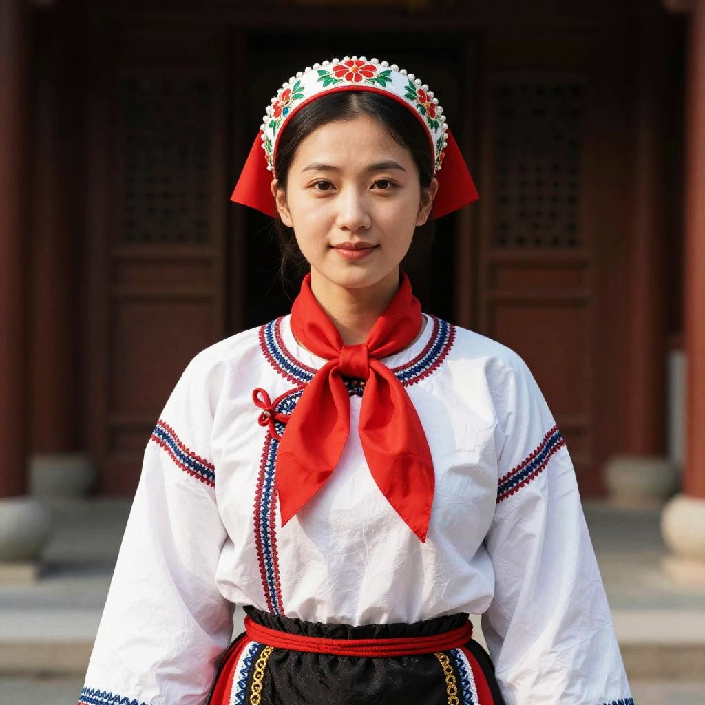 Photograph of an Asian woman with light brown skin, wearing traditional white embroidered blouse, red scarf, and colorful headpiece, standing confidently against a brown