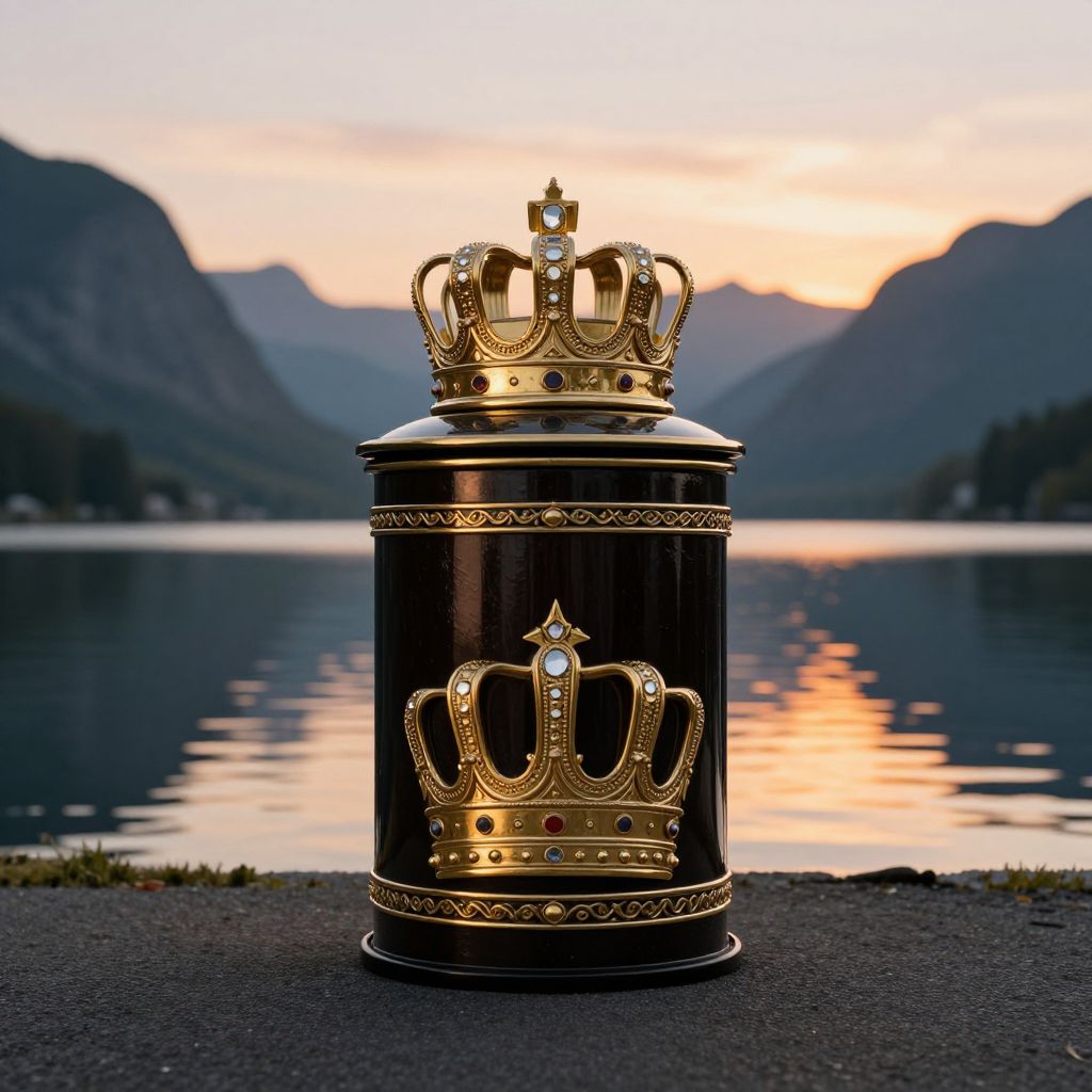 Photograph of a black cylindrical container with a detailed, ornate gold crown on top, positioned in the foreground. The container has a gold crown emblem on its front. The background features a serene lake with calm, reflective water, surrounded by dark, silhouetted mountains under a pastel-colored sunset sky, blending shades of pink, orange, and blue. The container rests on a dark, textured asphalt surface. The overall scene combines regal elegance with natural beauty, highlighting contrasts between the metallic crown and the tranquil, scenic landscape.
