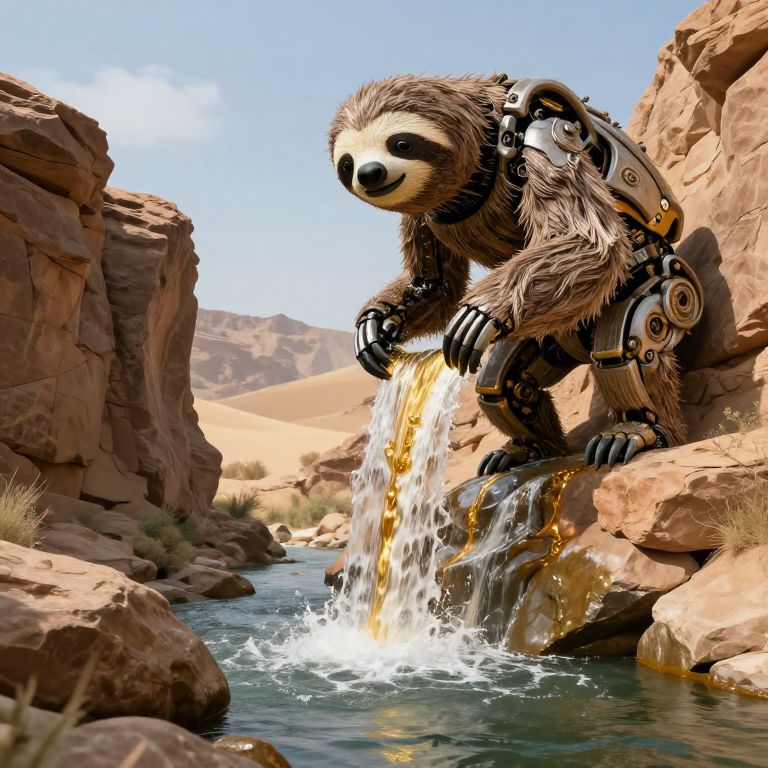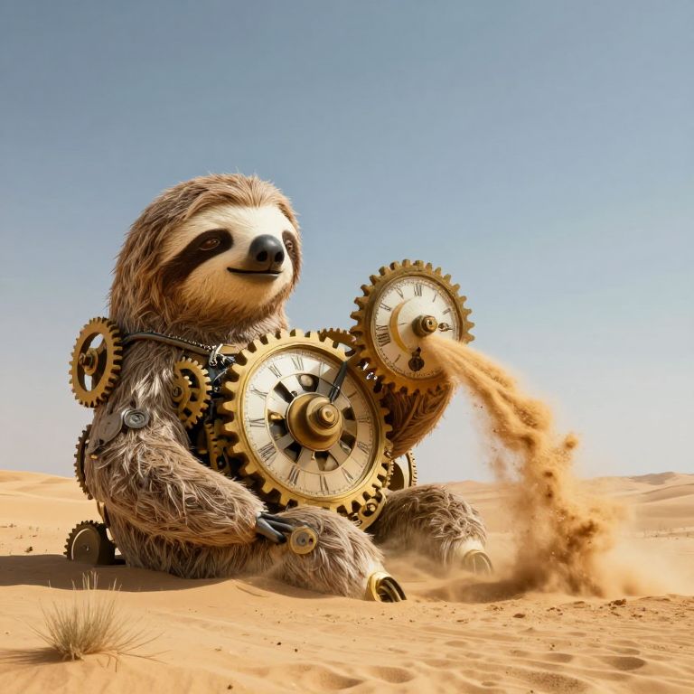 In a surreal desert landscape, a colossal clockwork sloth, its gears groaning with the weight of time, winds itself down, releasing a torrent of golden sand that defies gravity, symbolizing the relentless yet reversible flow of existence, while the air hums with the paradoxical whispers of eternity and transience.