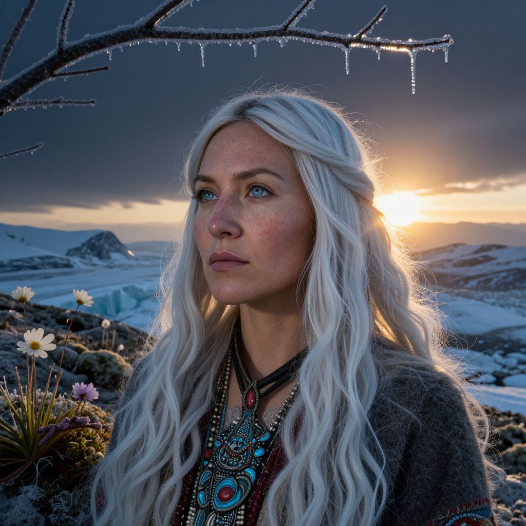 Capture a photorealistic portrait of a Native American woman with enigmatic allure. Her ice-blue eyes pierce through the frame, complemented by long, platinum hair cascading in soft waves over porcelain skin. The ethereal midnight sun illuminates her serene beauty, set against a glacial landscape where delicate arctic flowers and mosses flourish. She stands atop this arctic terrain, gazing thoughtfully toward the horizon, exuding a sense of tranquility and introspection. The ultrarealistic depiction showcases intricate details, such as a faint scar on her left cheek and subtle freckles dancing across her nose and temples. The golden hour sunrays filter through ice-crusted branches above, casting a unique interplay of light and shadow, enhancing the evocative scene of serenity and mystery.