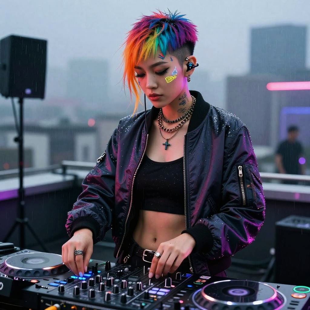 A cyberpunk scene featuring a confident female DJ with multicolored pixie cut and neon face tattoos, set in a rain-drenched rooftop party, wearing reflective bomber jacket and cybernetic earbuds, hyper-realistic, ray tracing, dynamic lighting, high detail