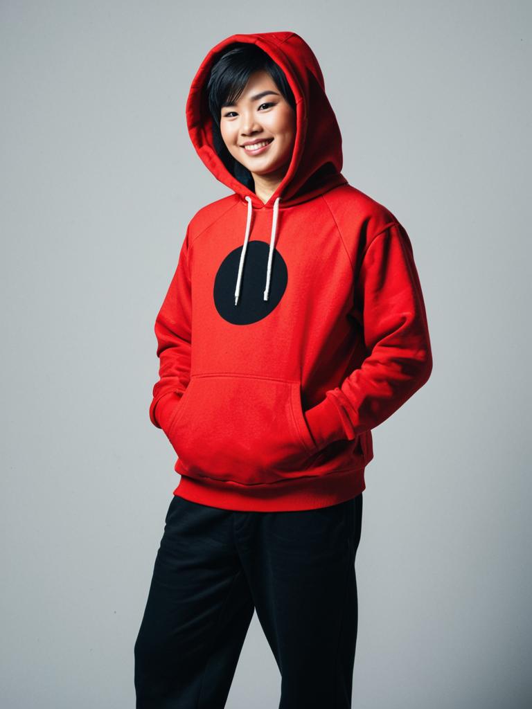 Pink woman costume plus size, 1girl, solo, hood, full body, pink footwear, standing, shoes, long hair, looking at viewer, hood up, black hair, realistic, asian