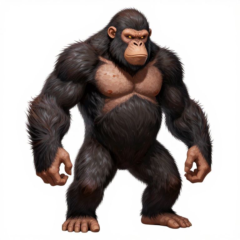 Digital illustration of a muscular, black-furred, humanoid gorilla with a stern expression, light brown chest, and fists clenched, set against a