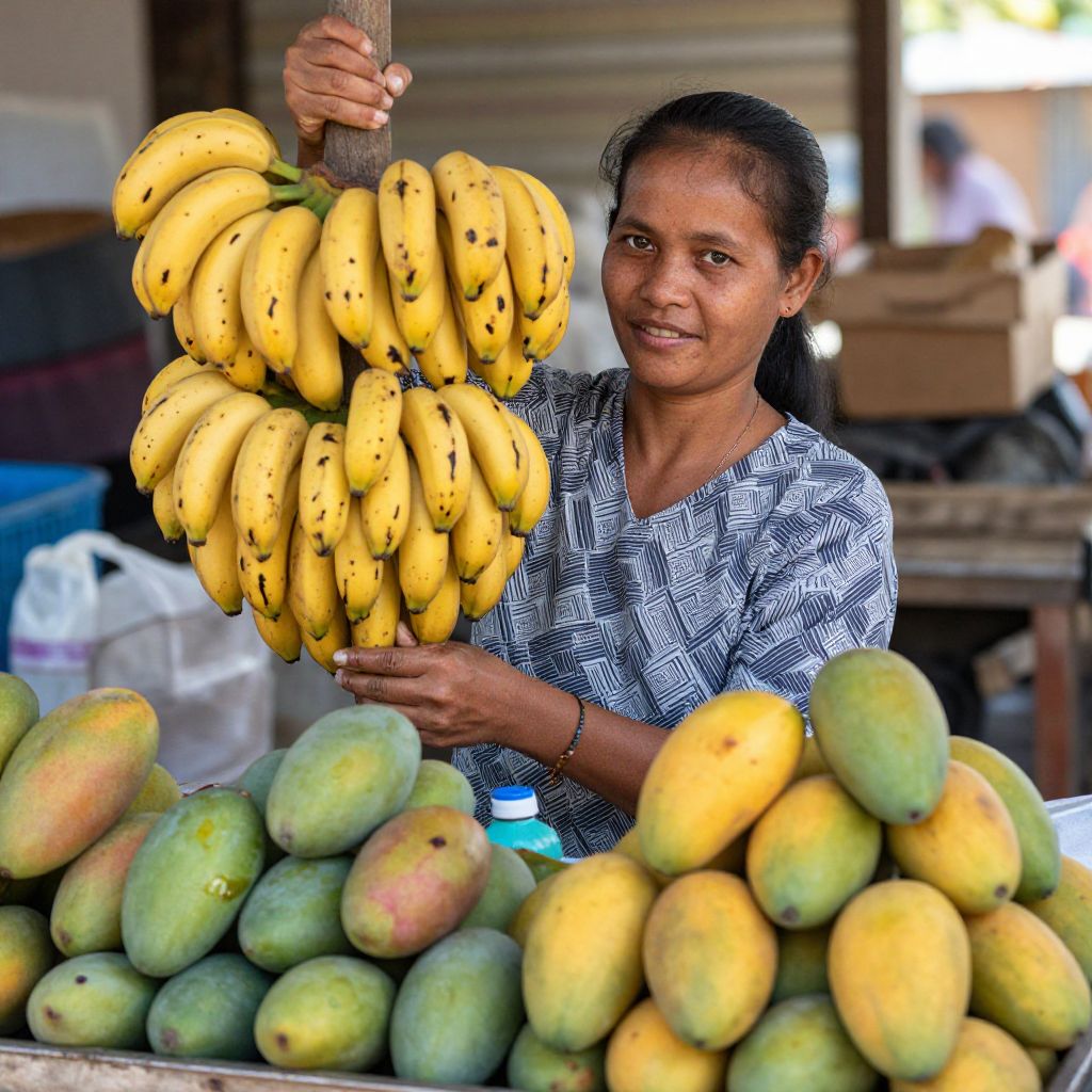 Photograph of a smiling Southeast Asian woman with dark skin and black hair, wearing a black-and-white patterned shirt, holding a bunch of yellow bananas