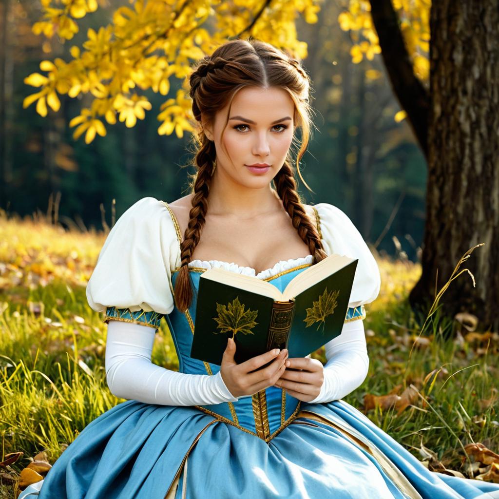 Book character costume, photorealistic, young woman, Renaissance-style dress, light blue and gold corset, white sleeves, holding open book, autumn forest background, soft sunlight, green grass, yellow leaves on trees, serious expression, brown hair in braided updo, digital art, high detail, female, elegant, nature setting, realistic ures, outdoor lighting, poised, vintage fashion