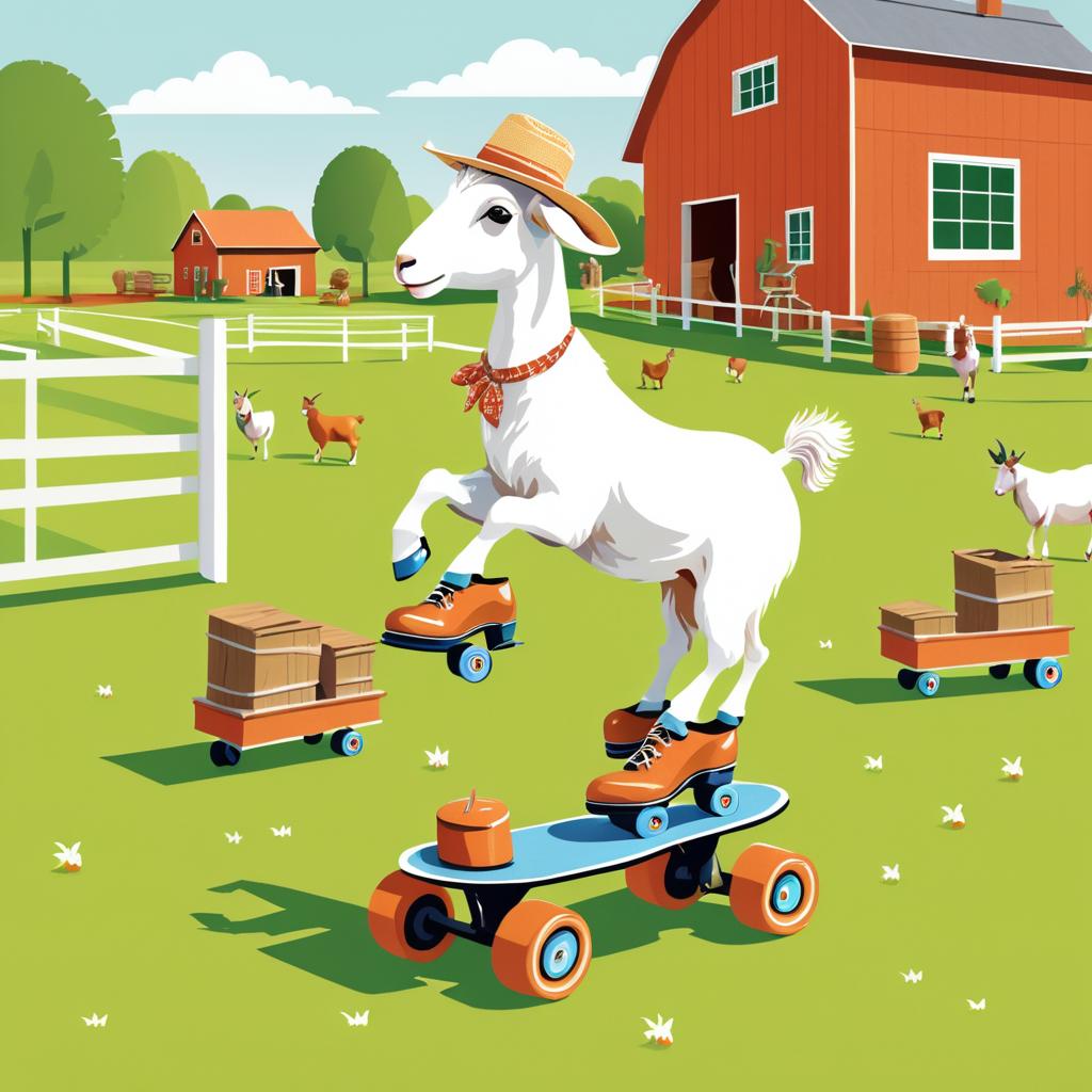 Humorous illustration of a goat riding a roller skates in a farmyard, featuring a tiny cowboy hat.