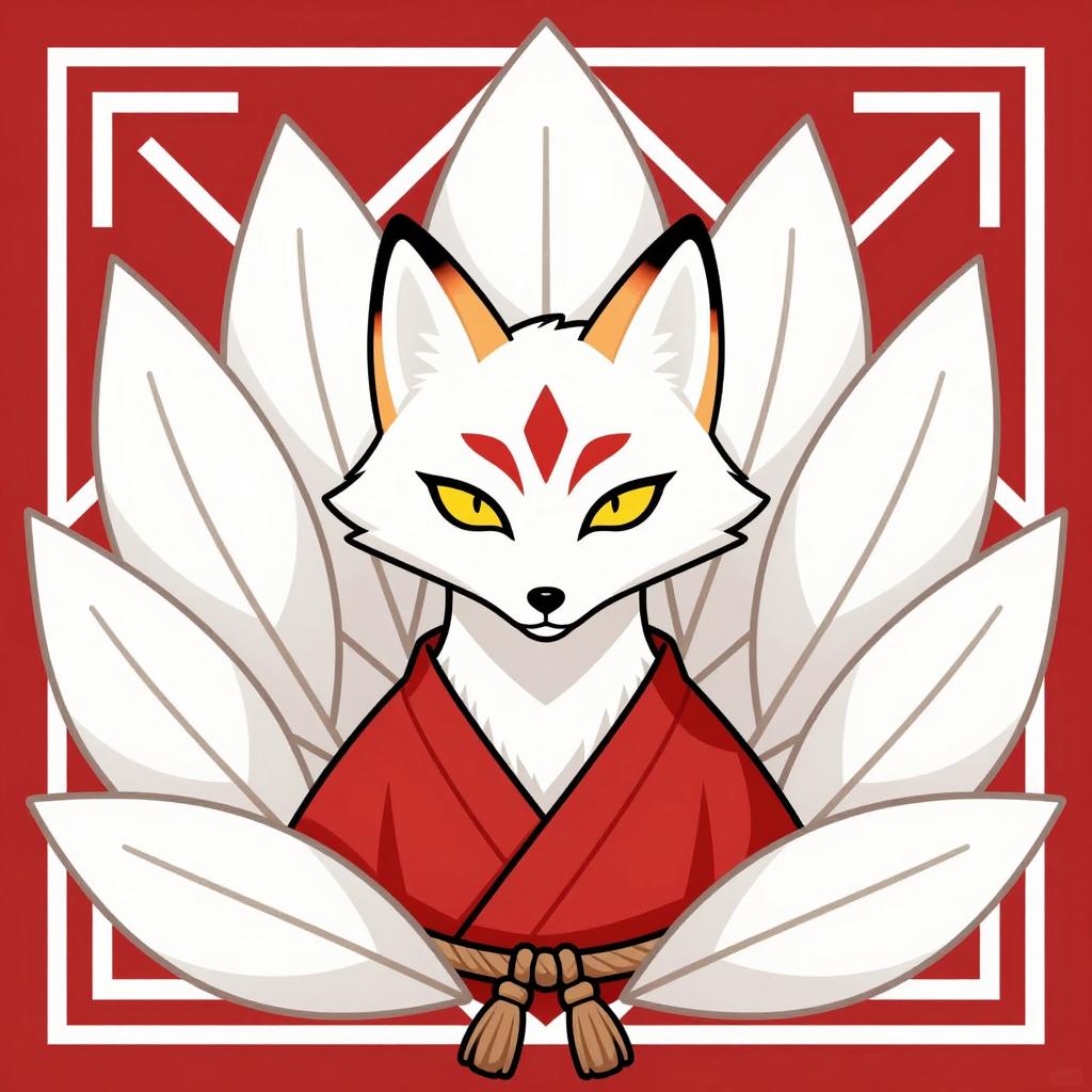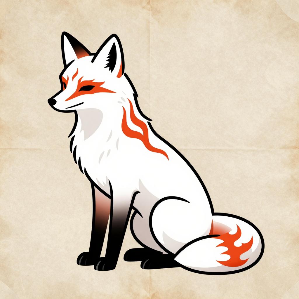 Illustration of an ornate hand fan featuring a white fox with red markings on the upper right side. The fan is decorated with pink flowers and green leaves on a golden background with intricate patterns. It includes a red ribbon tied at the base, holding a round bead and red tassels, set on a plain white background.
