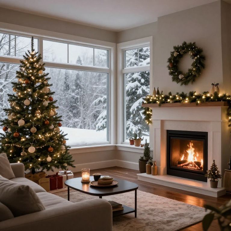 A cozy living room during Christmas holidays, with a fireplace, a decorated Christmas tree, and snow falling outside the large window.