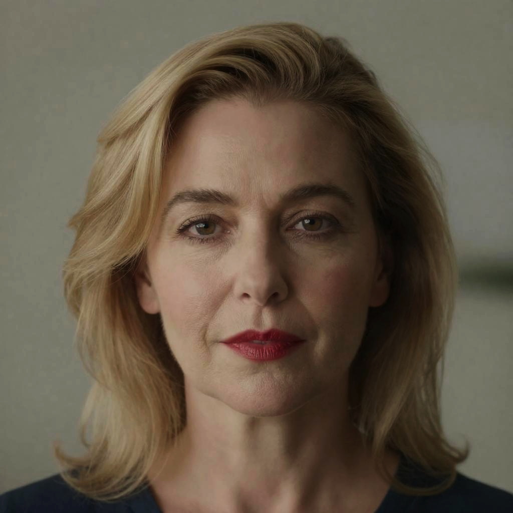 Photograph of a middle-aged woman with curly brown hair, light brown skin, and brown eyes, smiling gently. She wears a red shirt. Background is blurred with red and white patterns. Face centered, head slightly tilted.