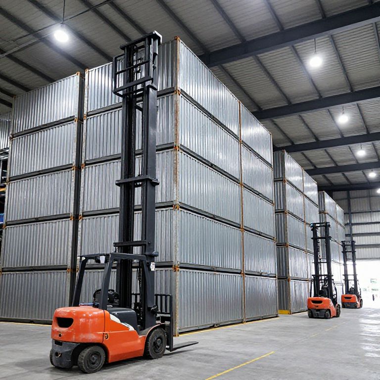 Modern logistics industry warehouses with towering metal containers and forklifts moving goods under bright warehouse lights