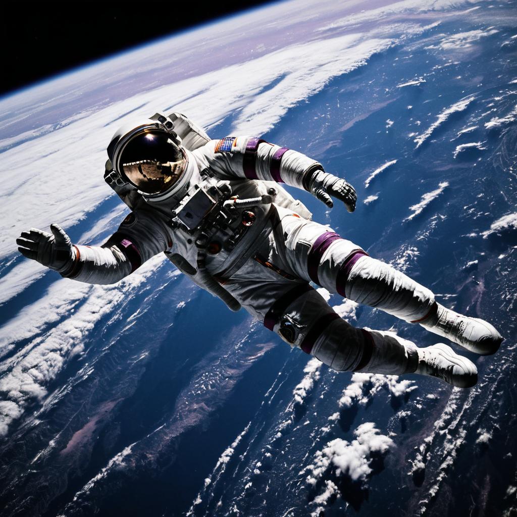 Ultra-realistic and highly detailed image of an astronaut in a white spacesuit with dark purple accents floating above Earth, showcasing the vast curvature of the planet and cloud formations under a dark space backdrop.