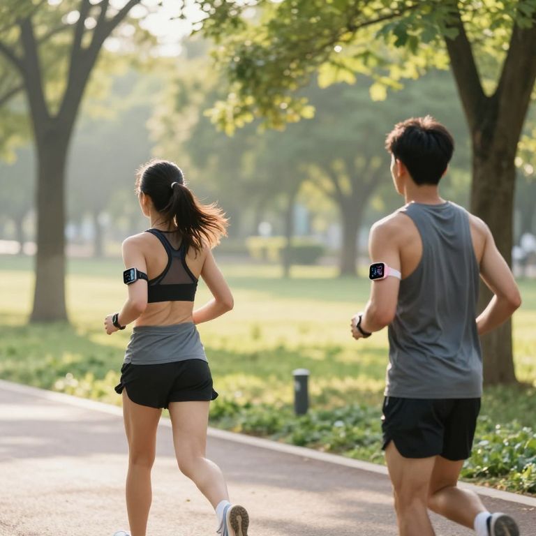 Trackers as sleek minimalist wearable devices on runners in a morning park, showing health metrics on small screens, bright and fresh outdoor environment with soft sunlight, trees and jogging paths, focus on technology blending with natural elements, realistic style.