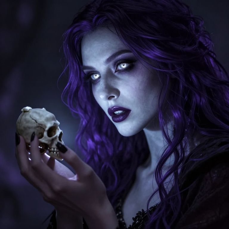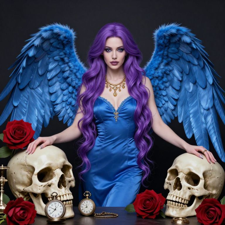 A beautiful angel with blue wings and long purple hair, adorned with a golden necklace and surrounded by roses, stands alongside a skull with wings, a retro pocket watch, and various ornate objects.