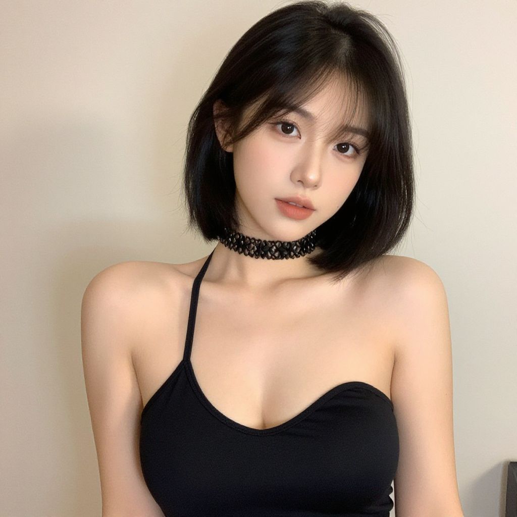 Photograph of an Asian woman with fair skin and short, straight black hair. She has large, dark eyes and is wearing a black spaghetti strap top that reveals her slender shoulders and collarbones. She also wears a black choker with small white beads. The background is a plain, light-colored wall. The lighting is bright, highlighting her smooth skin and delicate features. She gazes directly at the camera with a neutral expression. The image has a soft, slightly overexposed effect, giving it a gentle, almost ethereal quality.