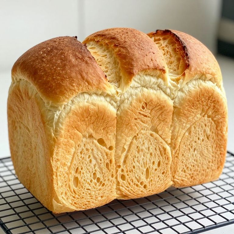 Golden-brown loaf bread rests on a cooling rack, showcasing its soft, airy interior filled with evenly distributed holes, while the top reveals a slightly cracked crust, hinting at its fresh bake.