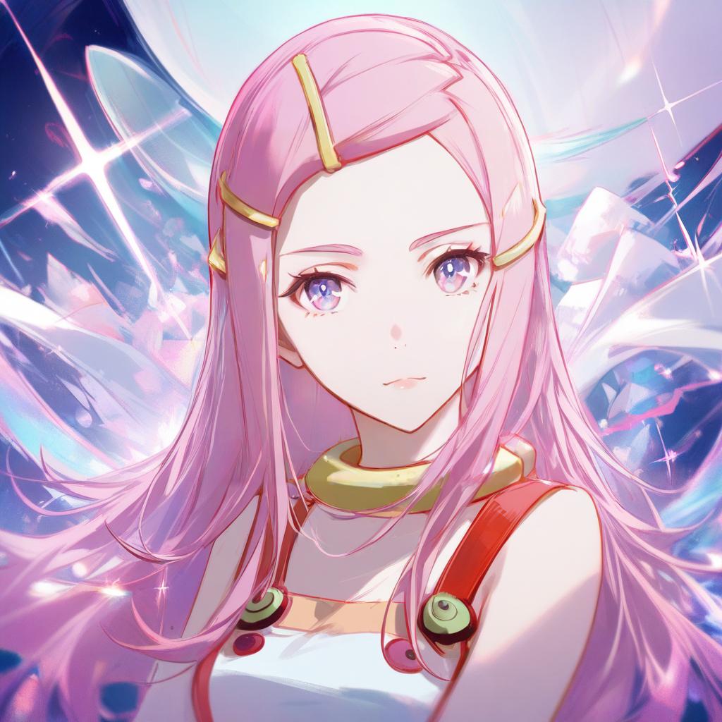 Digital anime-style illustration of a young female character with long pink hair held by gold hairclips, large purple eyes, and fair skin. She is wearing a sleeveless, light pink dress with brown straps and a thick gold choker necklace. The background is a soft lavender gradient with bokeh effects.