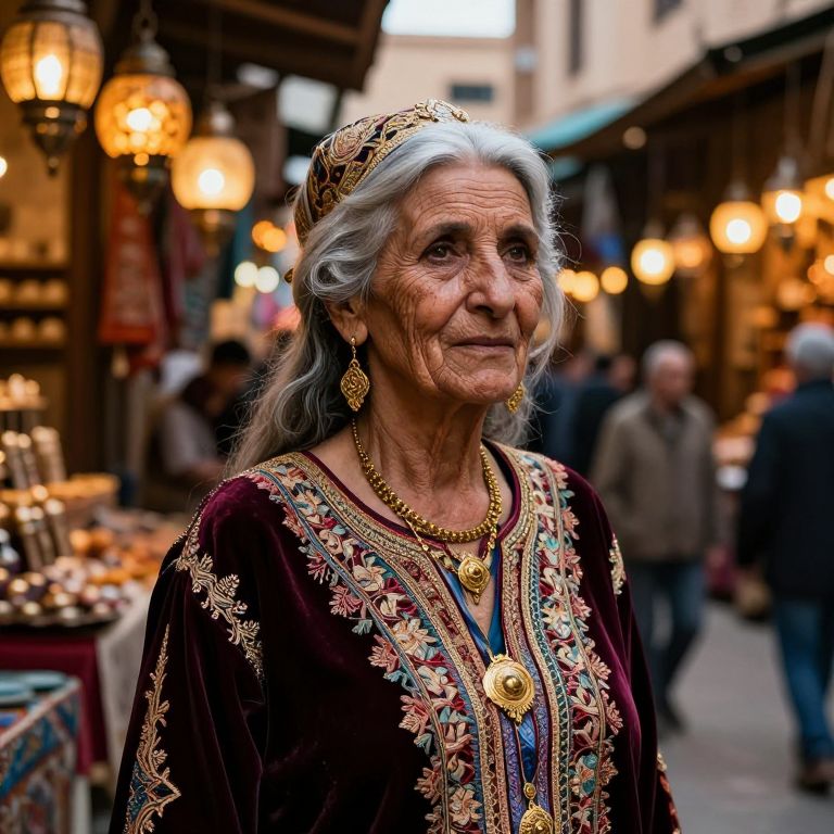 An ultrarealistic portrait depicts an experienced traveler with weathered skin and silver hair, her intricate features illuminated by the warm glow of lanterns in a Moroccan bazaar. Standing amidst the vibrant chaos, she exudes a captivating gaze that reflects nostalgia, adventure, and contemplation. Her attire, a richly embroidered caftan and delicate gold jewelry, mirrors the cultural essence of her surroundings. Captured from an unusual angle, the image blends her personal portrait with the bustling market life behind her, transporting viewers to another world.