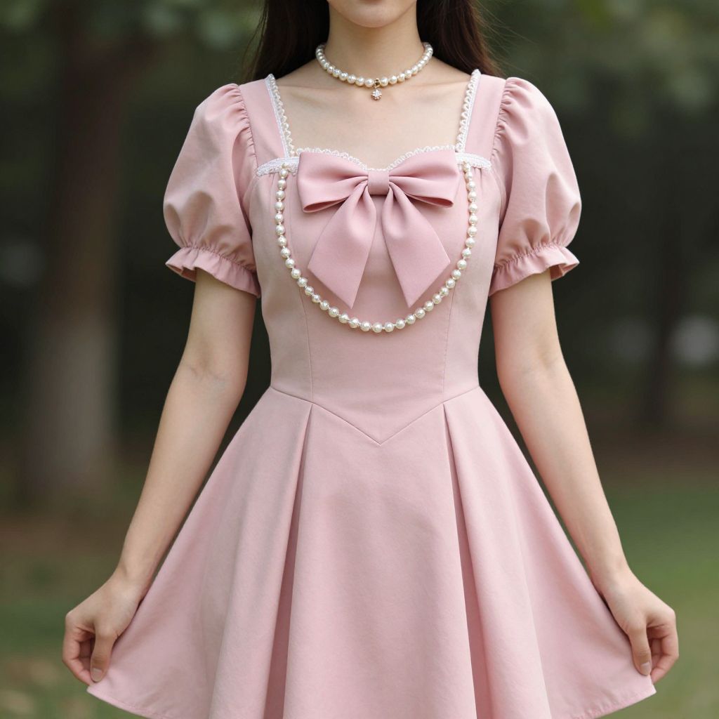 Photograph of an Asian woman wearing a pink, short-sleeved, vintage-style dress with a bow and pearl necklace, standing outdoors in a blurred
