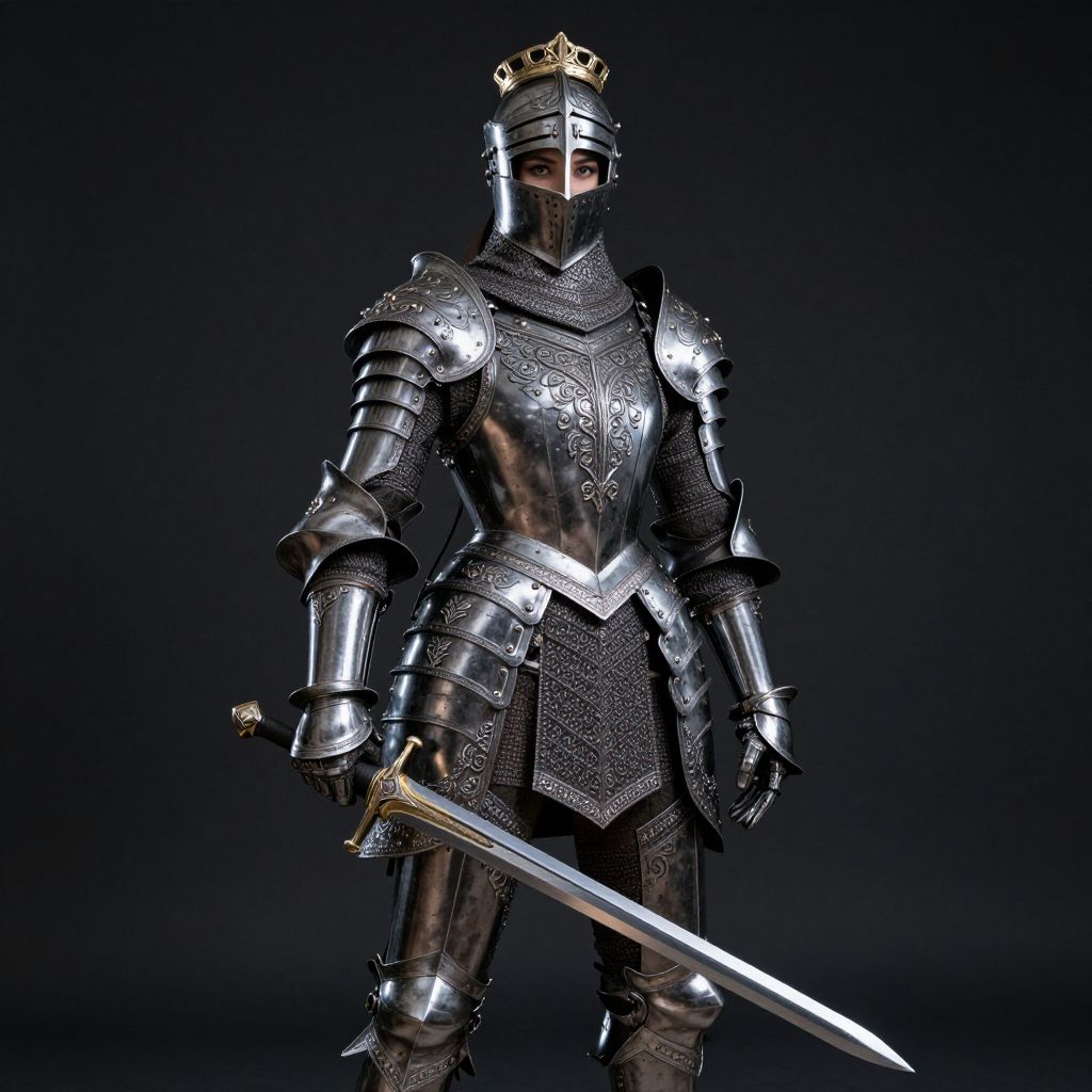 In the image, a woman is depicted in full armor, exuding an aura of strength and readiness. Her armor is intricately designed, featuring ornate patterns and embellishments that catch the light, creating a striking contrast against the dark background. The armor covers her from head to toe, with a helmet that has a crown-like structure on top, adding to her regal appearance. In her right hand, she holds a sword, its blade gleaming and sharp, ready for battle. The sword is held with a firm grip, suggesting preparedness and determination. The woman's expression is serious and focused, further emphasizing her readiness for combat. The overall composition of the image is balanced, with the woman centrally positioned and the armor and sword as the focal points, drawing the viewer's attention to her readiness and the intricate details of her attire.