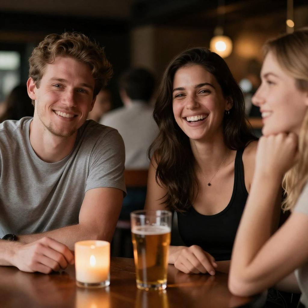 Photograph of four young adults standing close together outdoors under a clear blue sky. The group consists of three women and one man. A woman with light brown hair wears a white sleeveless top and jeans; a woman with dark skin and black hair wears a blue sleeveless top and jeans; a man with short brown hair wears a brown t-shirt; and another woman with dark hair wears a gray t-shirt. They hold colorful blue and orange disposable soda cups with straws.