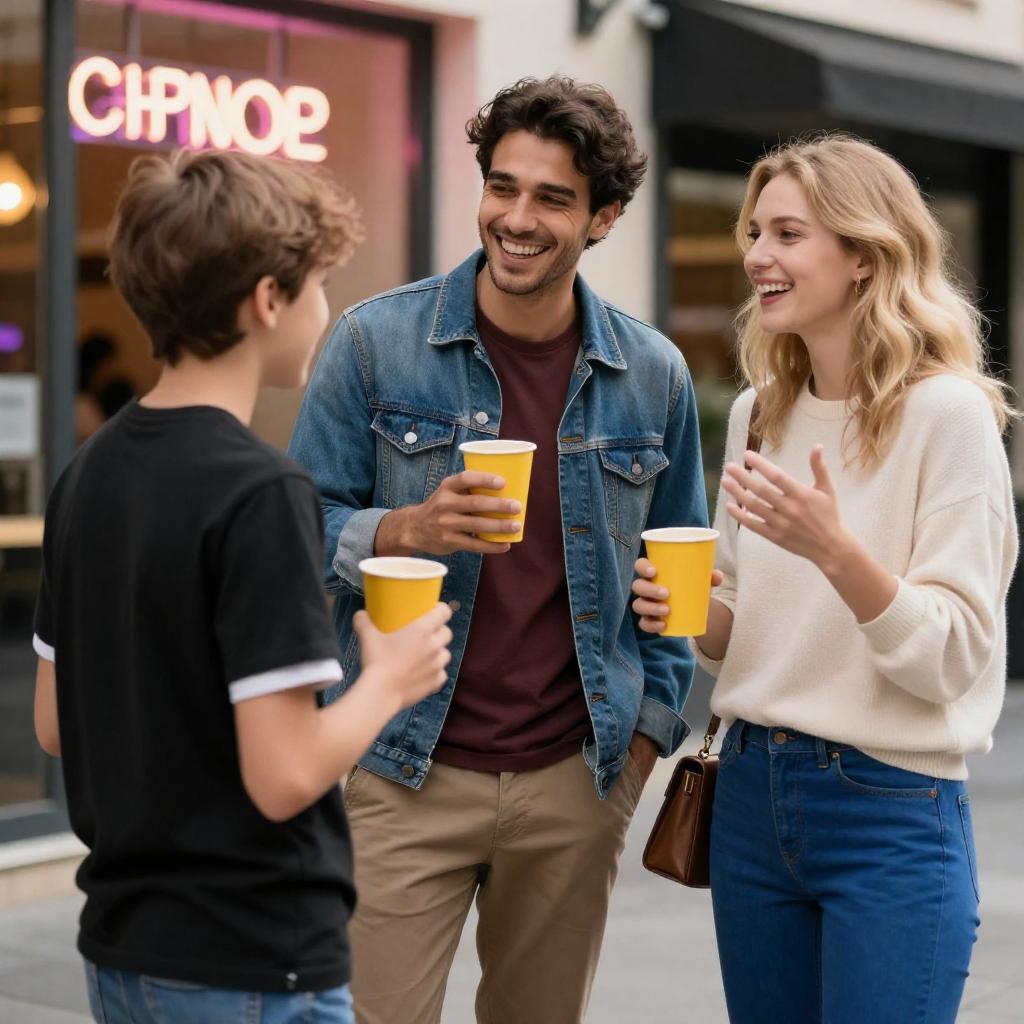 Photograph of four young adults standing close together, holding blue and orange soda cups. From left to right: a woman with light brown hair in a white sleeveless top, a woman with dark skin and black hair in a blue top, a man with short brown hair in a brown shirt, and a woman with dark hair in a gray shirt. They are outdoors with a bright blue sky in the background.
