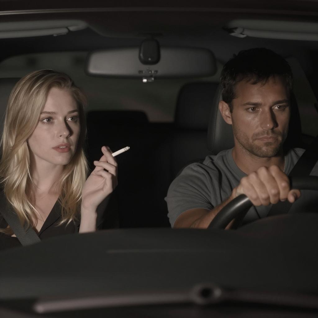 Nighttime scene, two people. Woman with long, disheveled blonde hair, wearing a shiny blue jacket, leaning into a car. Man with bald head, dark clothing, sitting inside the car. Low light, shadows, car window on left. Woman's hand on car door. Dark background with faint lights. Intense expressions.