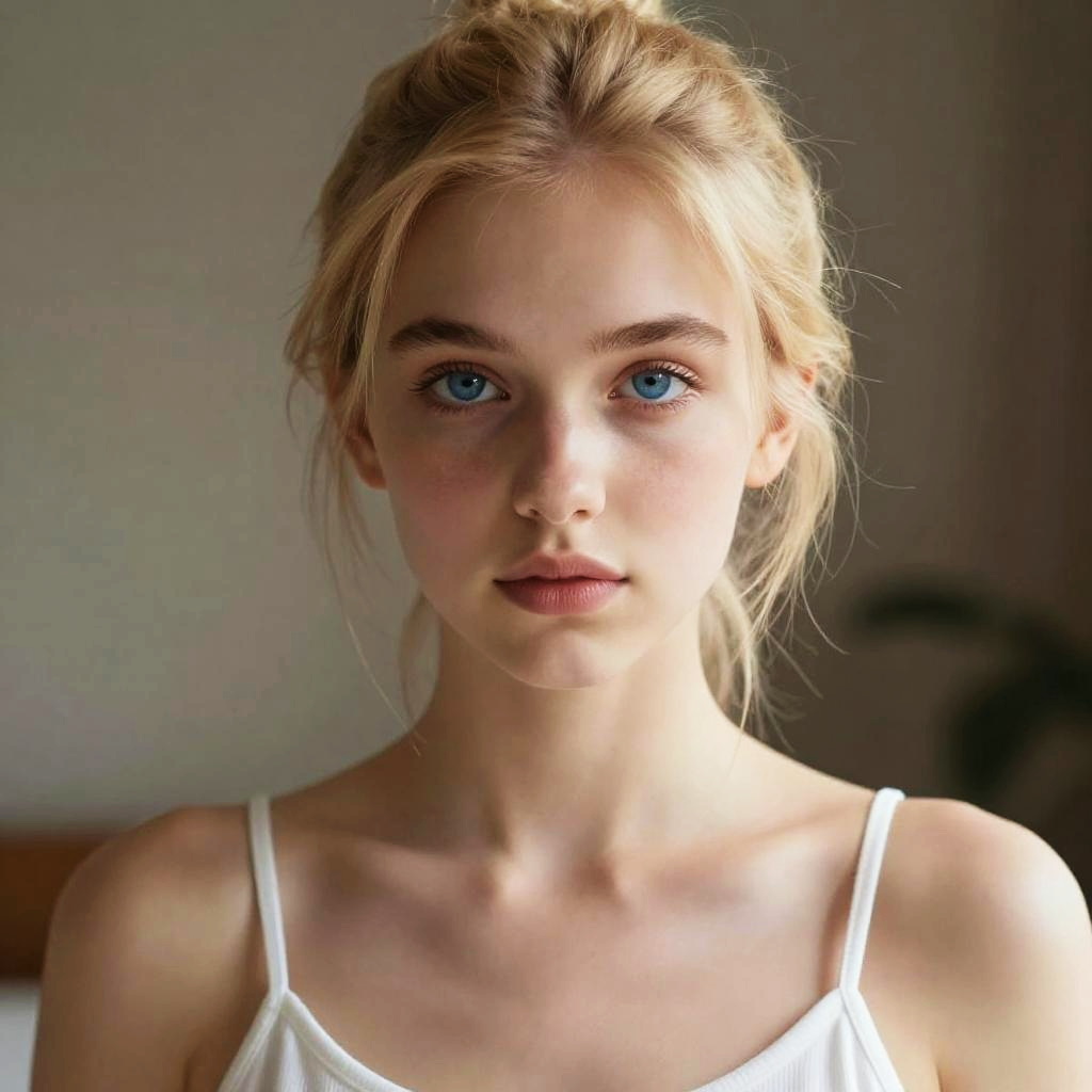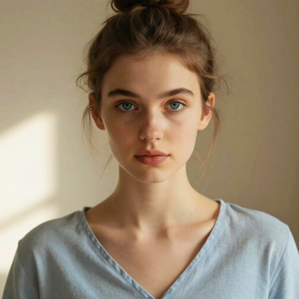 Photograph of a young woman with fair skin and light brown hair tied in a messy bun. She has striking blue eyes, subtle pink lips, and a gentle expression. She's wearing a light blue, V-neck shirt. The background is softly lit with warm, yellowish light, creating a soft contrast with her slightly shadowed face. The image has a natural, slightly ethereal feel.