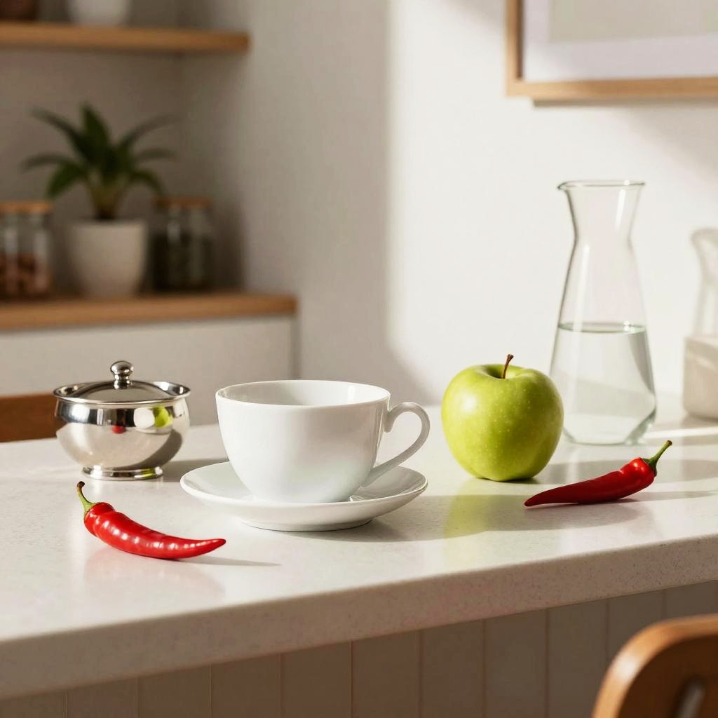 A playful, vibrant still life on a sleek modern breakfast bar, featuring white porcelain teacup, green apple, silver sugar bowl, red chili pepper, glass water carafe. Rendered in clean Scandinavian minimalism, with warm sunlight, soft shadows, bold color blocking, tactile textures, and a softly blurred shelf of plants and jars in the background; balanced composition, cozy domestic ambiance, shallow depth of field.