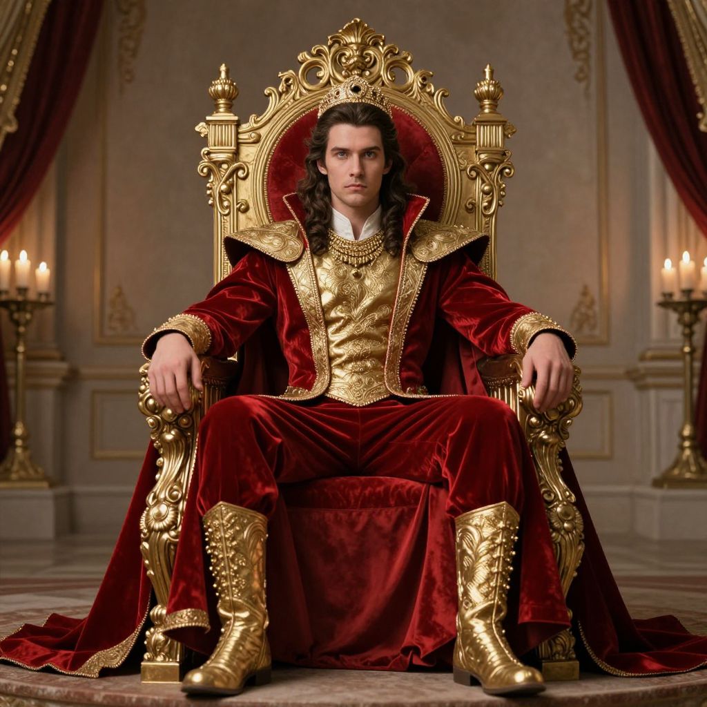 Photograph of a stern-faced man with long brown hair, wearing a gold-embroidered, red velvet royal throne, ornate gold boots,