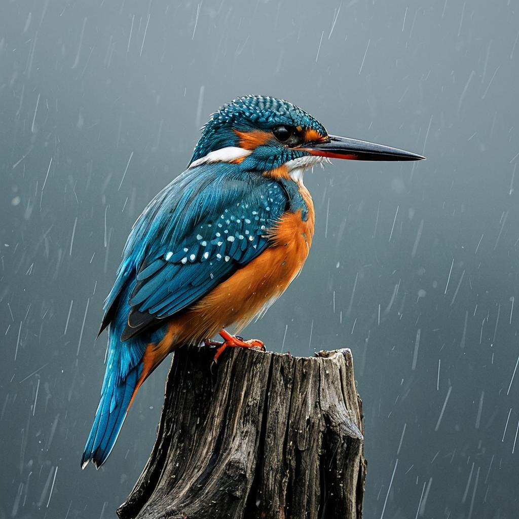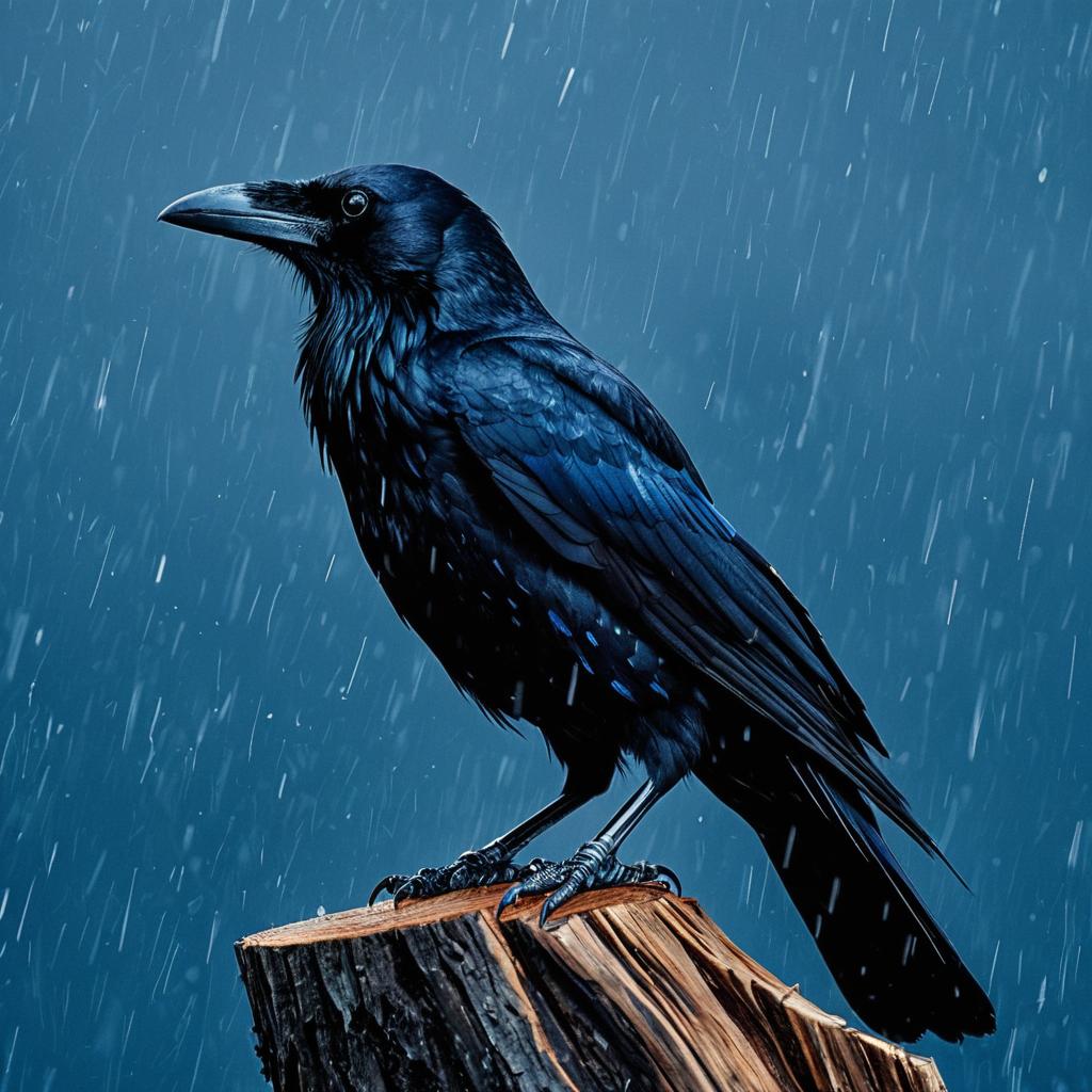 Detailed close-up of a graceful swan perched on a smooth stump, predominantly black background, striking white and gray feathers with soft brown on wings, wet appearance suggesting recent rain, highly realistic