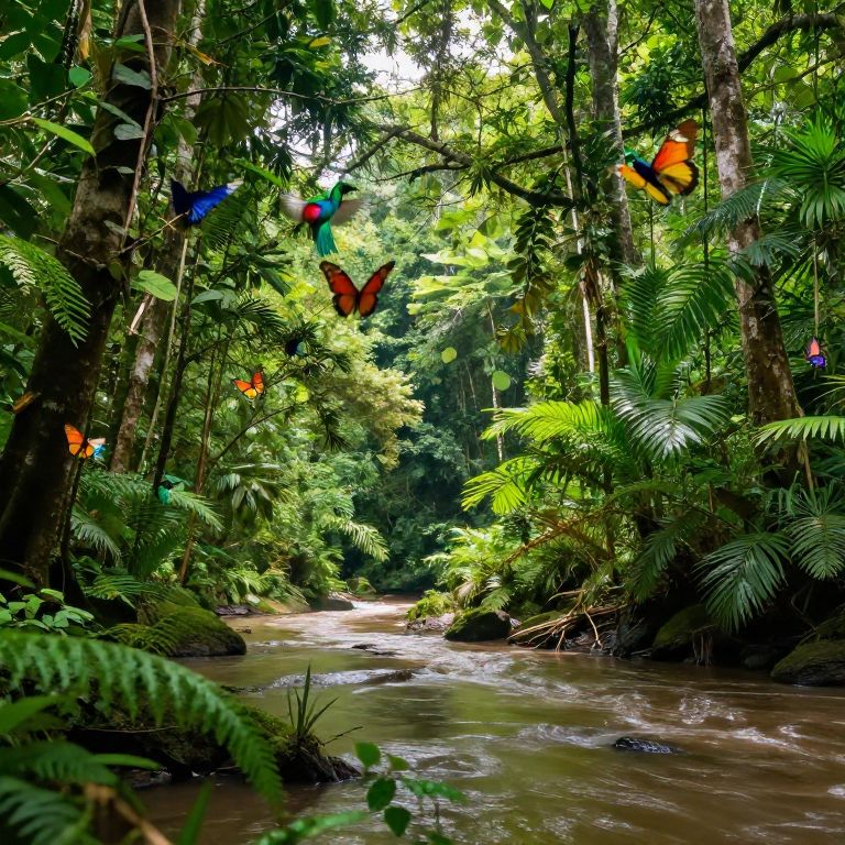 Frondoso jungle scene with dense green foliage, towering ancient trees covered in thick vines, shafts of sunlight piercing through the leaves, a serene river flowing gently, rich biodiversity with exotic birds and wildlife, hyper-realistic style, vibrant colors
