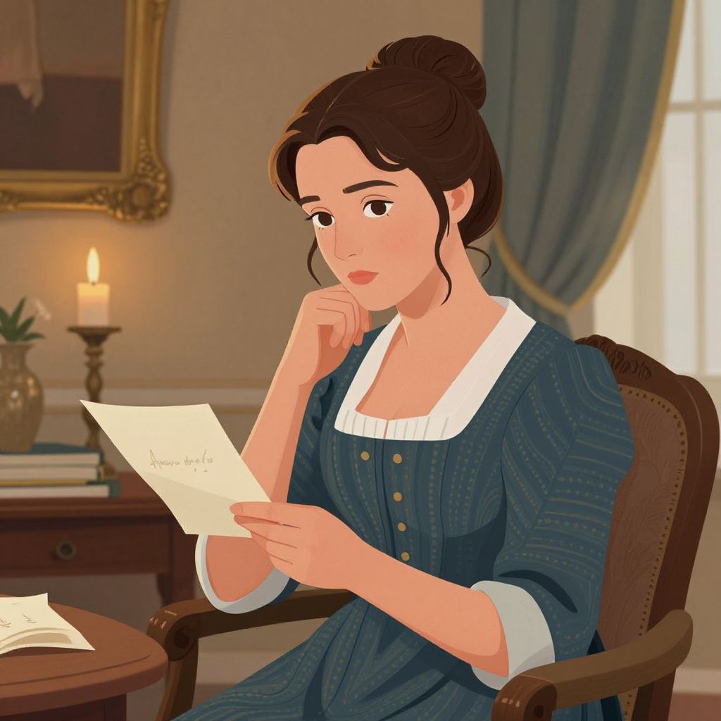A digital illustration depicts a woman in period attire, reminiscent of Jane Austen's era, holding a letter with a contemplative expression, set against a warmly lit interior with vintage decor and dramatic lighting, evoking the tension and drama of a classic literary scene.