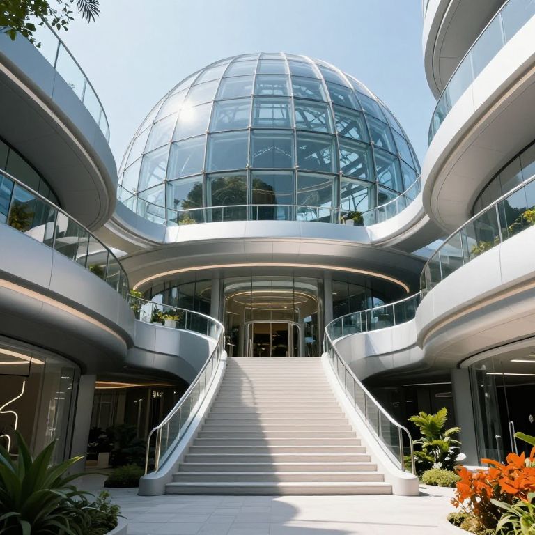 Photograph of a modern, glass-domed building with curved, metallic balconies and a central staircase, surrounded by bright greenery and red flowers.