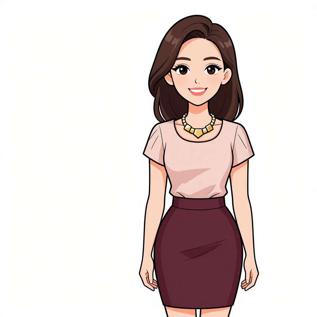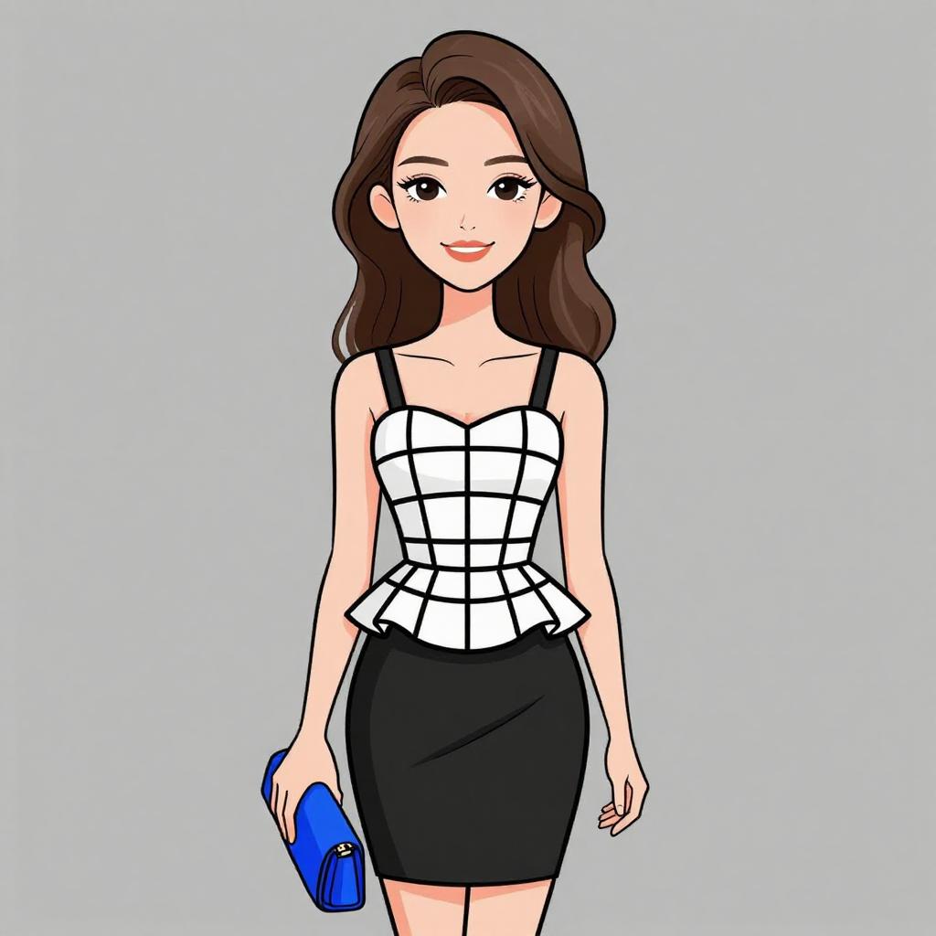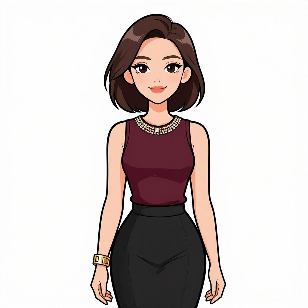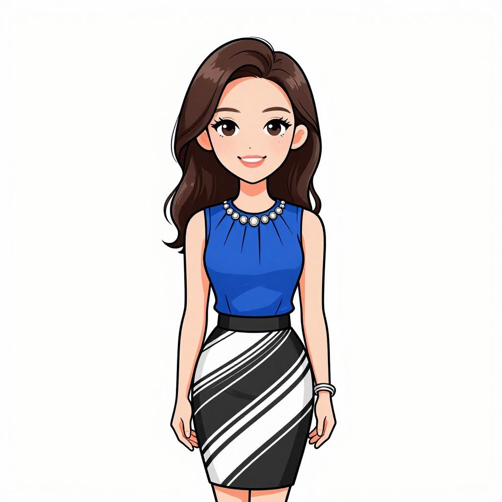 Woman with pretty face and pretty hair. smiling Woman, business casual, sleeveless royal blue blouse with pleats, embellished round neckline with white gemstones, black and white graphic print pencil skirt knee-length, silver bangle bracelet. --sref 1467