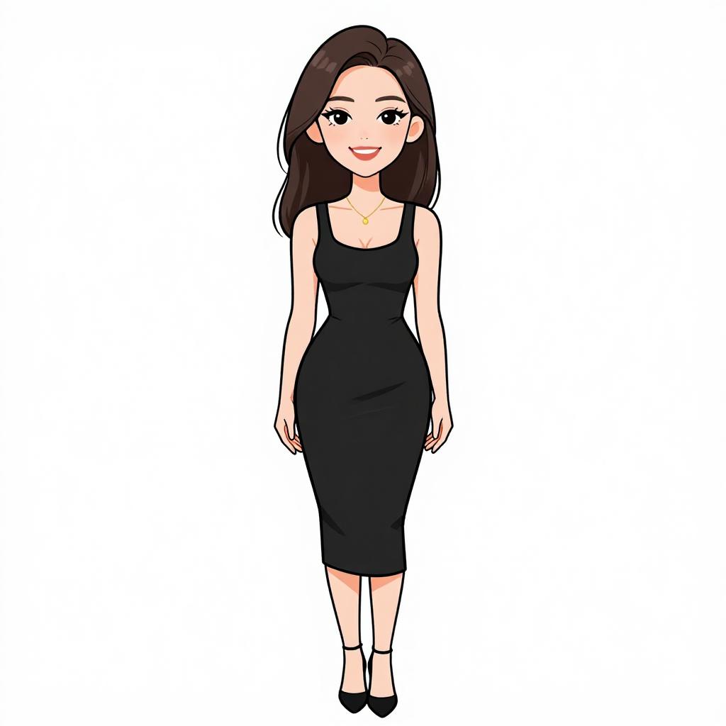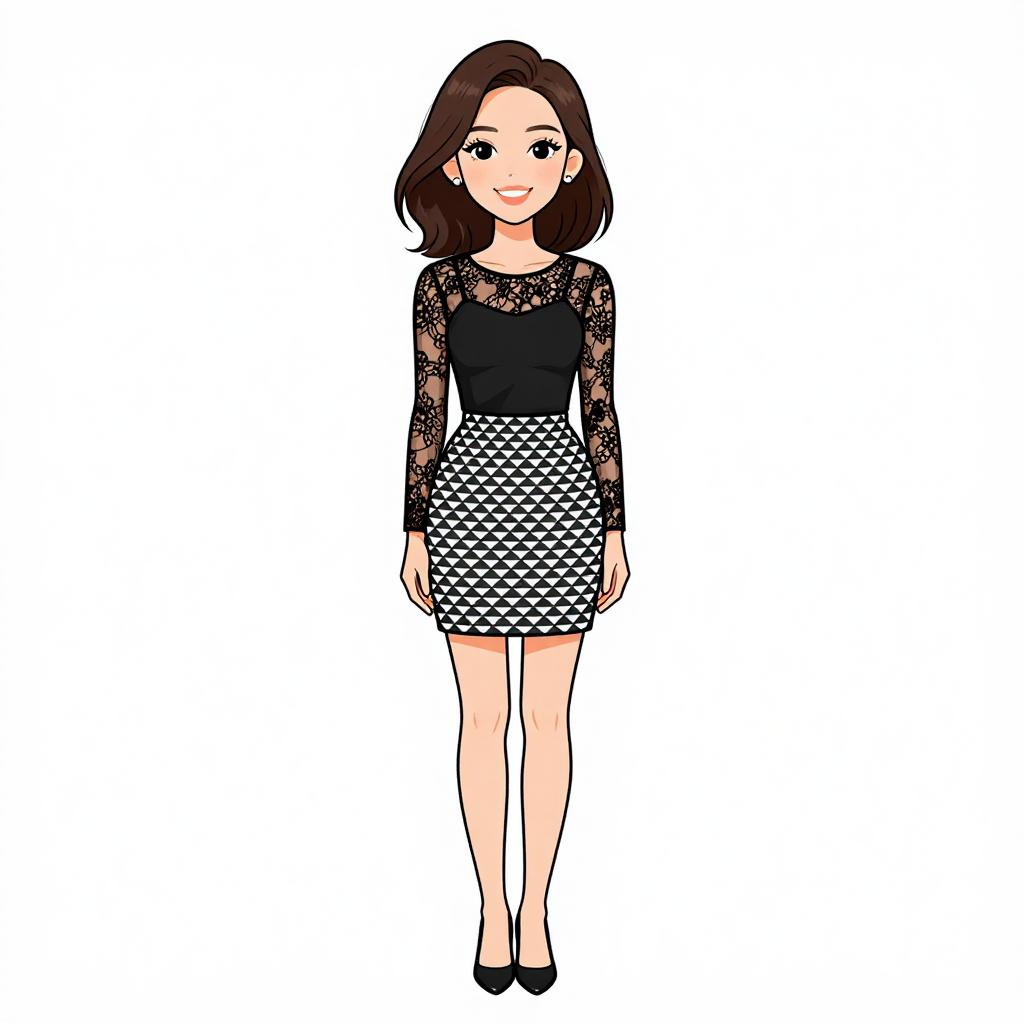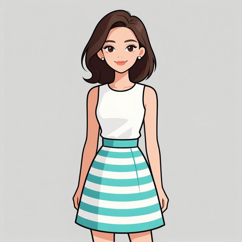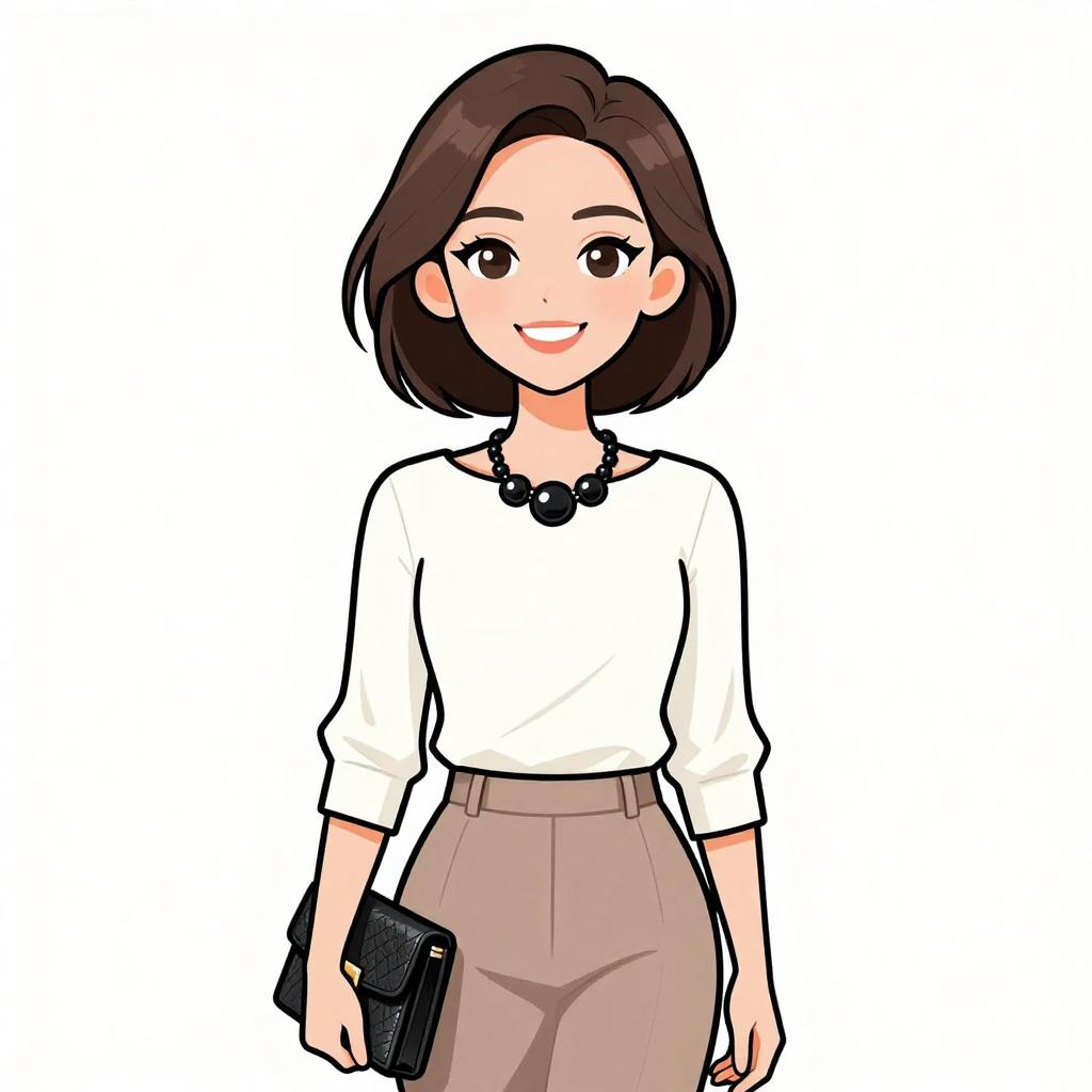 Woman with pretty face and pretty hair. smiling Woman, business casual, sleeveless royal blue blouse with pleats, embellished round neckline with white gemstones, black and white graphic print pencil skirt knee-length, silver bangle bracelet. --sref 1467