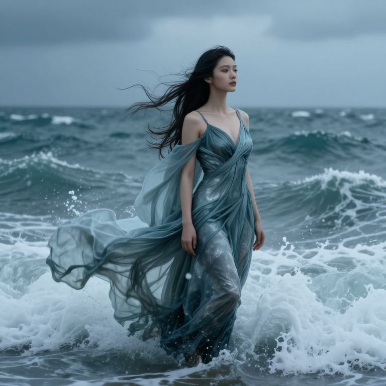 Photograph of a woman with long black hair in a flowing, sheer, gray dress standing in ocean waves under a cloudy sky.