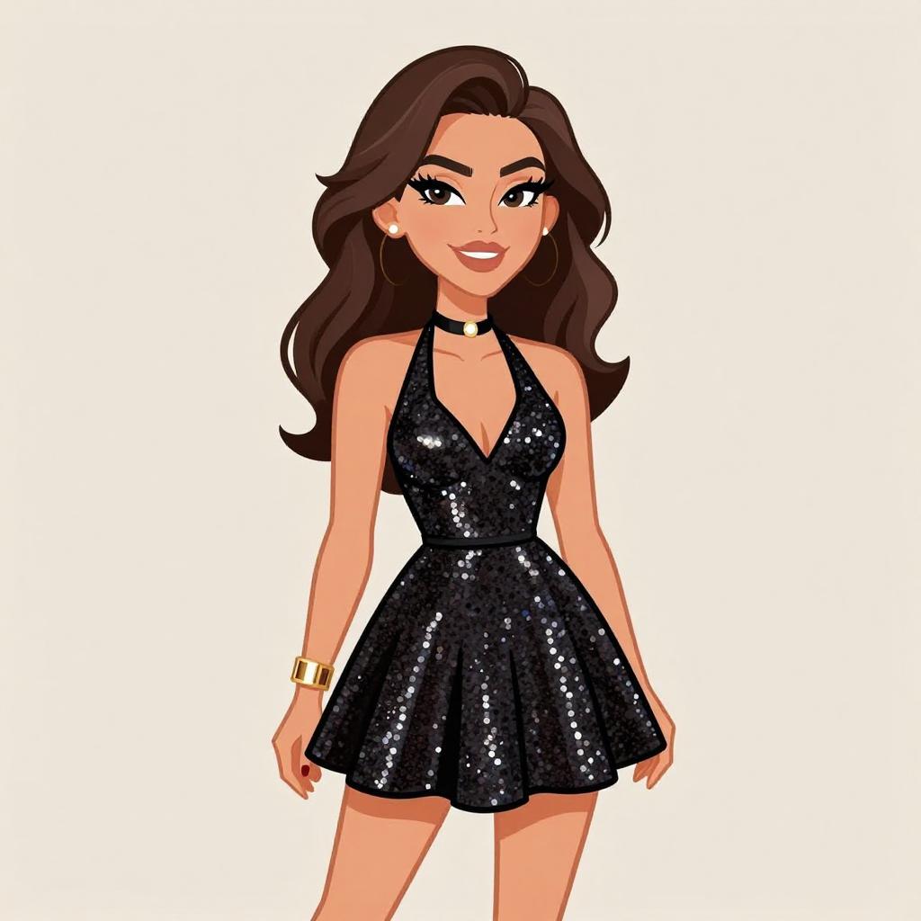 Woman with pretty face and pretty hair. smiling Woman, glam, halterneck skater dress with shimmering sequins, keyhole back, fitted waist, flared skirt, mini length, pairing with a choker necklace and a cuff bracelet. --sref 1467