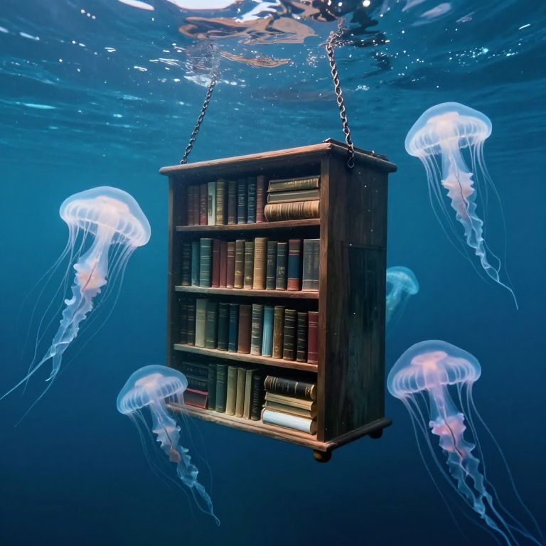 A silverfish the size of a city swims through a subterranean library, consuming ancient tomes for a diet of forgotten knowledge.