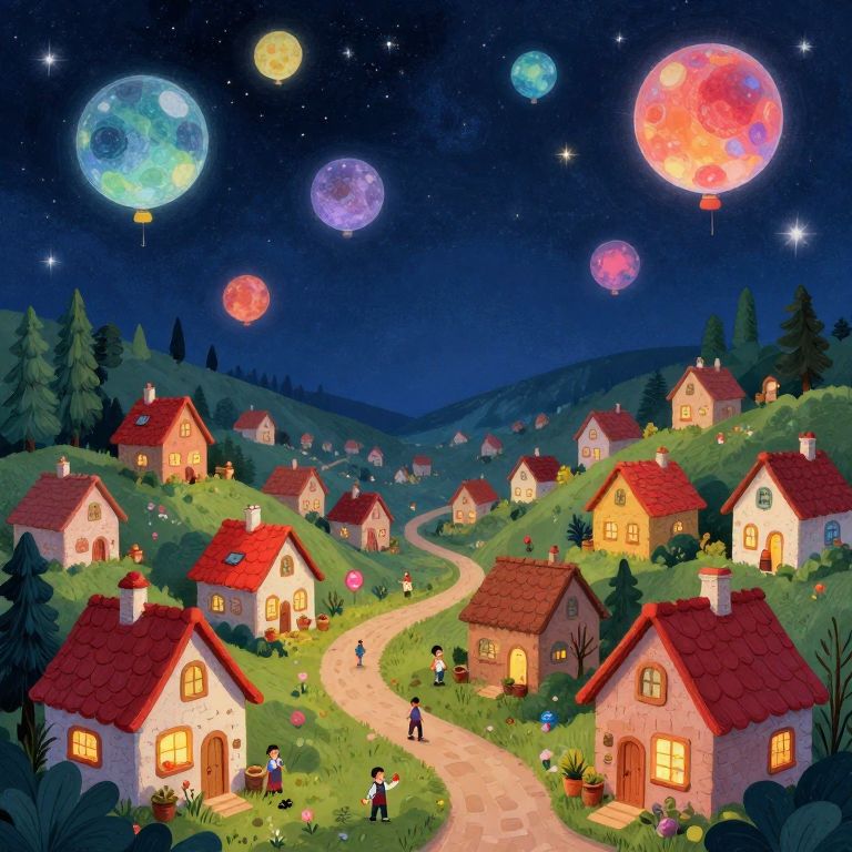 Whimsical, night-time forest illustration of a glowing, fairy-tale cottage with a blue roof, lit windows, and a smoking chimney, surrounded