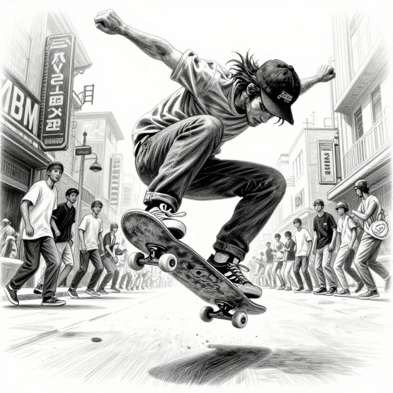 Decagon professional pencil drawing of a mutant skateboarder performing a kickflip in the middle of a crowded street, highly detailed, illustration, shading, cool colors,