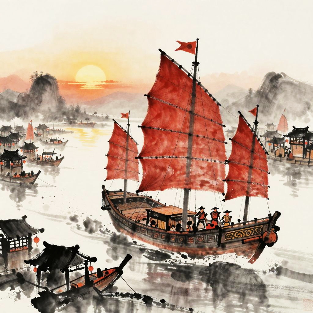 A Sumi-e style ink wash painting, illustrating a traditional Chinese junk with crimson sails sailing into a bustling medieval Southeast Asian spice harbor at sunset.